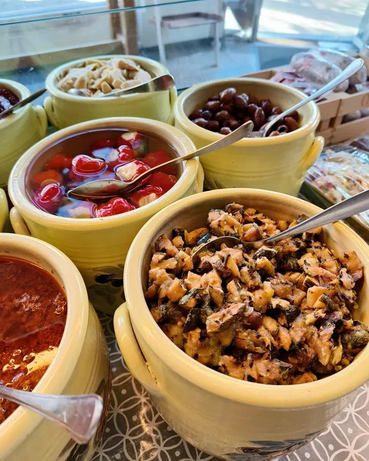 Zo kunt u (indien gewenst) ook uw eigen bakjes meenemen, voor onze verse olijven/zongedroogde tomaatjes/sweetpeppers/tapenades/aïoli en pesto.